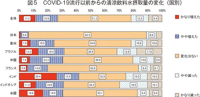 新型コロナウイルス感染症(COVID-19)流行前後における清涼飲料水の摂取量の変化について世界全体で見ると、5割強が「変化はない」とし、また、3割弱は「かなり増えた・やや増えた」となり「かなり減った・やや減った」を上回った(図5)。