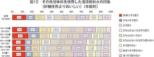 砂糖使用の清涼飲料水よりおいしいか否かについては、4割強が肯定的とし、3割強が否定的であった(図11)。