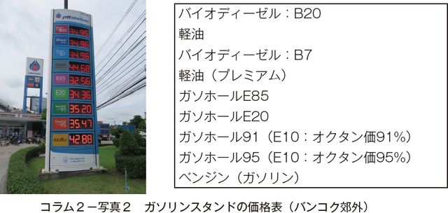 タイでは、自動車の燃料として主に植物油を原料としたバイオディーゼル(軽油代替燃料:脂肪酸メチルエステル)と、ガソリンにバイオエタノールを混合したガソホールが広く流通している(コラム2−写真1)。同国ではガソホールの普及促進のための補助制度があり、補助金により一般的なガソリンよりも安価になることで、利用促進が図られている。また、エタノールの混合率が高くなるほど、安価となるよう設定されている(コラム2−写真2)。