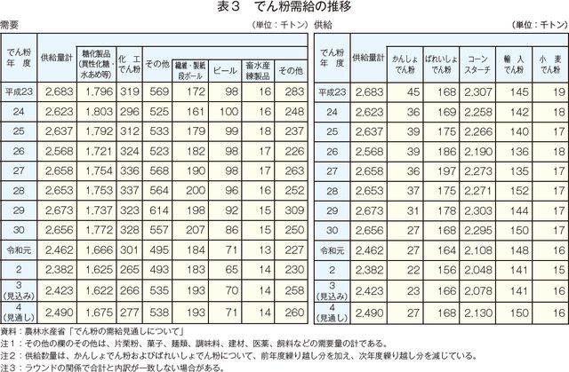 3SYについて、需給見通しによると、夏場の高温・少雨による不作の影響を受けばれいしょの収穫量が減少したことから、ばれいしょでん粉の生産量は、前年度比8.6%減の14万8000トンとなる見込みである(表6)。