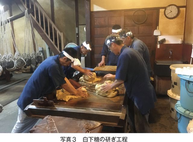 こうして出来上がった白下糖は、職人さんたちの手によって板の上で「研ぎ」とよばれる砂糖の粒子を細かくする工程を経ることで、糖蜜が抜けやすくなります(写真3)。