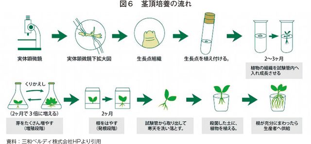 三和ベルディで行われている茎頂培養とは、植物の茎の先端(茎頂)にある生長点の頂端分裂組織を利用した繁殖方法である(図6)。増殖された苗はメリクロン(mericlone)と呼ばれ、分裂組織(meristem)由来の栄養系(clone)を意味している5)。一般的には、ウイルスフリー苗、バイオ苗、メリクロン苗などとも呼ばれている。