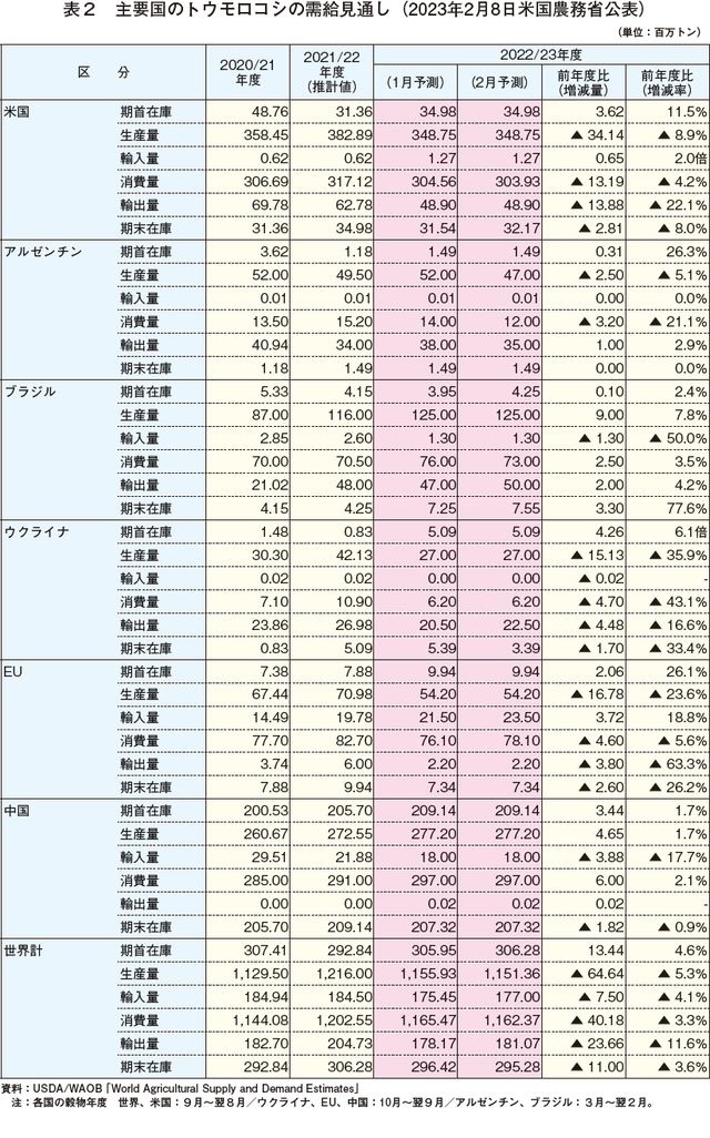 米国農務省世界農業観測ボード(USDA/WAOB)および米国農務省海外農業局(USDA/FAS)は2023年2月8日、2022/23年度の世界のトウモロコシ需給予測値を更新した(表2)。