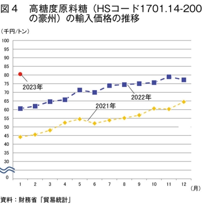 2023年1月の甘しゃ糖・その他の豪州からの高糖度原料糖の1トン当たりの輸入価格は、8万536円(前年同月比32.8%高、前月比4.3%高)であった(図4)。
