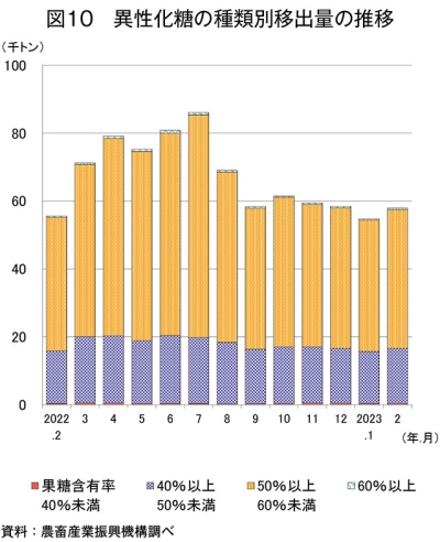 2023年2月の異性化糖の移出量は、5万7913トン(前年同月比4.3%増、前月比5.7%増)であった(図9)。