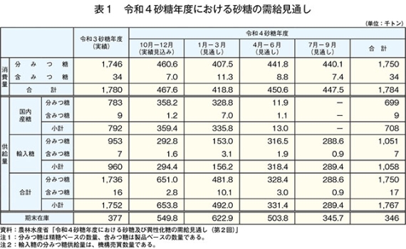 農林水産省は、「砂糖及びでん粉の価格調整に関する法律」(昭和40年法律第109号)により、四半期ごとに砂糖および異性化糖の需給見通しを公表している。令和4年12月に「令和4砂糖年度における砂糖及び異性化糖の需給見通し(第2回)」を公表した(詳細は