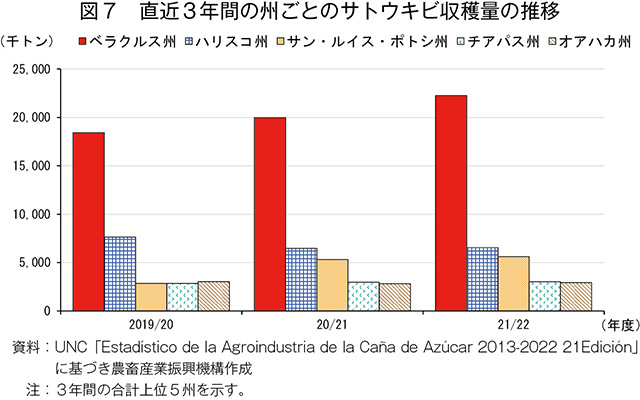 メキシコは、国内32州のうち15州でサトウキビを生産しており、その生産地域は沿岸部の海抜数メートルから、内陸部の標高1300メートル付近まで広がっている(図6)。過去10年間の収穫面積はおおむね80万ヘクタール程度、収穫量も平均5300万トン台で推移しており、単収は1ヘクタール当たり70トン弱である(表3)。サトウキビの生産量が最も多い州はメキシコ湾沿岸のベラクルス州であり、2021/22年度は2225万トンと国内生産量の5割弱を占めている(図7)。次いで太平洋沿岸のハリスコ州、内陸部のサン・ルイス・ポトシ州が同1割強と続き、これら上位3州で国内生産量全体の7割弱を占める。サトウキビの生産には現在18万5000人が従事しているとされており、また、収穫面積は80万ヘクタールと日本の約34倍であるが、歴史的な背景