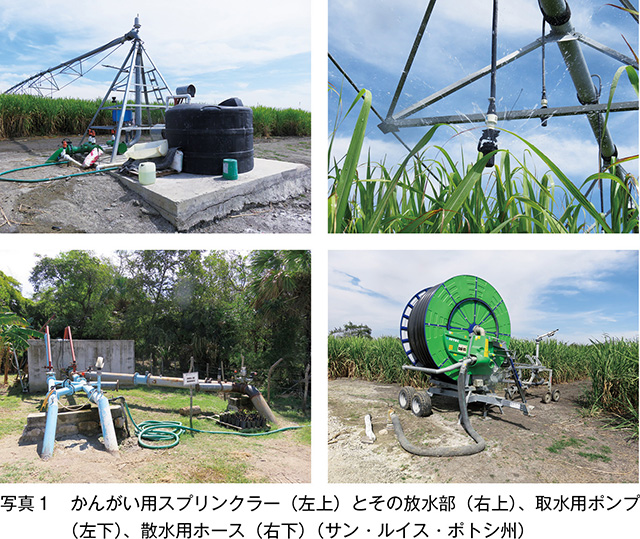 また、同国のサトウキビ生産地は全体的に水源が不安定であり、かんがいが可能な圃場はサトウキビ栽培面積の3割にとどまるなど、サトウキビの生産は雨季の降水量に左右される。しかし、近年は製糖企業などの指導や支援によりスプリンクラーや放水ポンプの導入が徐々に進んでいる地域もある(写真1)。一方で、メキシコでも労働者不足は深刻な問題とされ、近年は高学歴化などを背景とした職業選択の自由度が高まったことや付加価値の高い作物(テキーラの原料となるリュウゼツラン、アボカド、ベリーなど)への転作などにより、サトウキビ生産の人員確保が困難であるという。また、機械化が進まず依然として焼き畑と手刈りが主流であることから、サトウキビ関連の生産者連合(UNC:Unión Nacional de Cañeros A.C.)では、労働力不足を解消する手段として、収穫機の導入を推進するため、その性能を評価するプロジェクトを開始している。このプロジェクトでは、これまでタイから9台の収穫機を輸入し、さまざまな地域や条件下で実地試験を行っている。