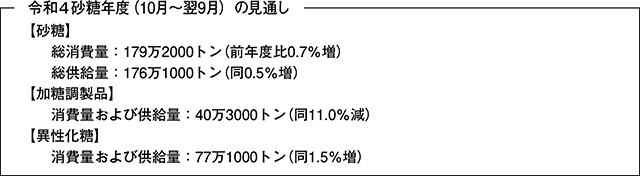 農林水産省は、「砂糖及びでん粉の価格調整に関する法律」(昭和40年法律第109号)により、四半期ごとに砂糖および異性化糖の需給見通しを公表している。令和5年6月に「令和4砂糖年度における砂糖及び異性化糖の需給見通し(第4回)」を公表した。