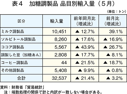 5月の加糖調製品の輸入量は前年同月から大幅に減少