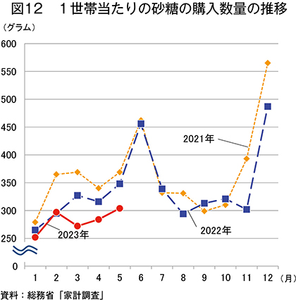 総務省「家計調査」によると、2023年5月における100世帯当たりの砂糖の購入頻度は30、1世帯(二人以上)当たりの支出金額は100円(前年同月比2.0%安、前月比29.9%高)であった(図11)。また、同月の1世帯当たりの砂糖の購入数量は、304グラム(同12.6%減、同7.0%増)であった(図12)。