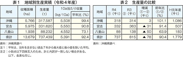 沖縄地域では収穫面積(前年比24ヘクタール増)、10アール当たり収量(同35キログラム増)ともに前年並みであったことから、生産量は前年並みであった。宮古地域は収穫面積が48ヘクタール増加とほぼ前年並みであったが、10アール当たり収量が574キログラム減少したため、生産量は減少した。八重山地域では収穫面積が184ヘクタール減少し、10アール当たり収量も前年より1958キログラム減少したことから、生産量は大きく減少した。