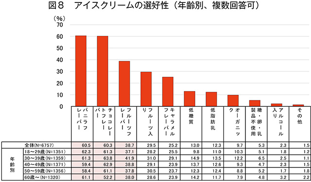 年齢別では、すべての年代層で「バニラフレーバー」「チョコレートフレーバー」「フルーツフレーバー」が上位3位を占める結果となった(図8)。