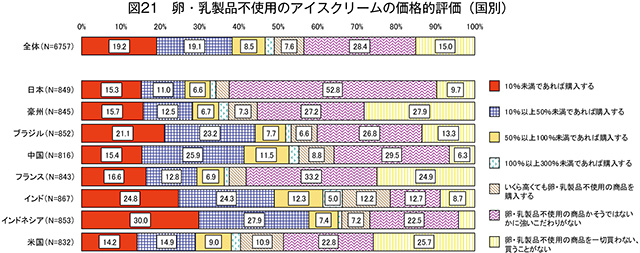 価格的評価について8カ国全体では、3割弱が「卵・乳製品不使用の商品かそうではないかに強いこだわりがない」とし、次いで「10%未満であれば購入する」「10%以上50%未満であれば購入する」が続いた(図21)。
