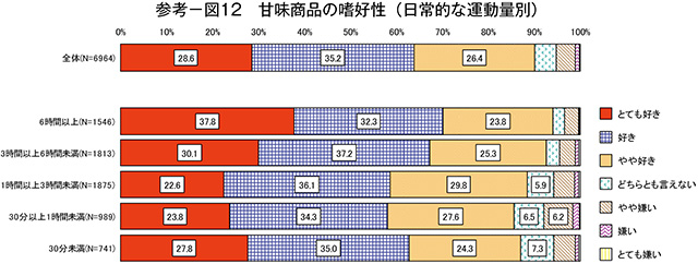 年齢別では、「週に1回以上」は30〜39歳が最も高く、次いで18〜29歳が高い(図3)。一方で40代以降は漸減し、砂糖およびチョコレートの摂食頻度と同様に、加齢に伴い低下する傾向にあり、60歳以上の6割弱が「月1回以下」、1割弱が「全く摂食しない」としている。