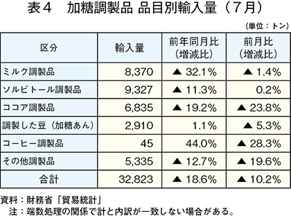 7月の加糖調製品の輸入量は前年同月から大幅に減少