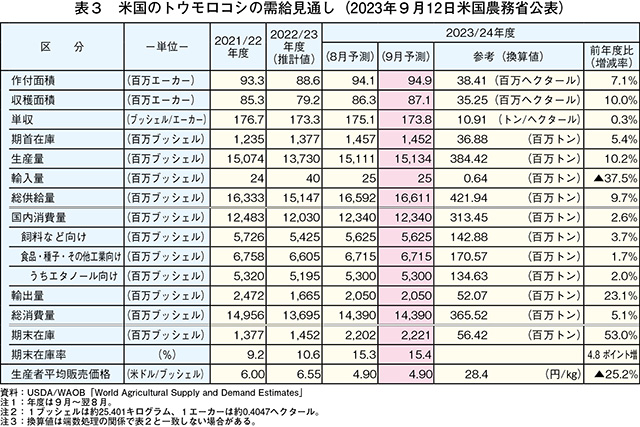 USDA/WAOBは同日、2023/24年度(9月〜翌8月)の米国のトウモロコシ需給見通しを更新した(表3)。