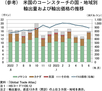 米国農務省経済調査局(USDA/ERS)によると、同国中西部市場における23年6月のコーンスターチ価格は、1ポンド当たり19.45米セント(注)(28.6円、前年同月比13.4%安、前月比2.4%安)と前年同月からかなり大きく、前月からわずかに下落した。