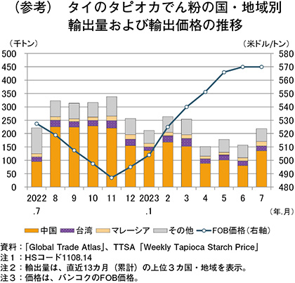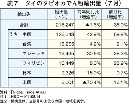 2023年7月のタピオカでん粉輸出量は、21万8247トン(前年同月比1.6%減、前月比38.9%増)と前年同月からわずかに減少したものの、前月から大幅に増加した。同月の主要国・地域別輸出量は表7の通りである。