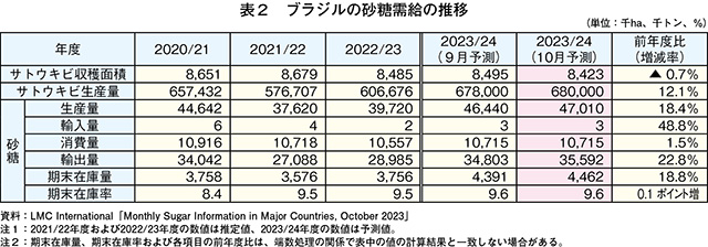 (注1)(75万ヘクタール、前年度比0.4%増)とわずかに増加、サトウキビ生産量は4700万トン(同14.1%増)とかなり大きく増加すると見込まれる。これによる、サトウキビの増産と前年度の砂糖生産量(527万トン)から予想される砂糖生産量は、約600万トンと見込まれる。
