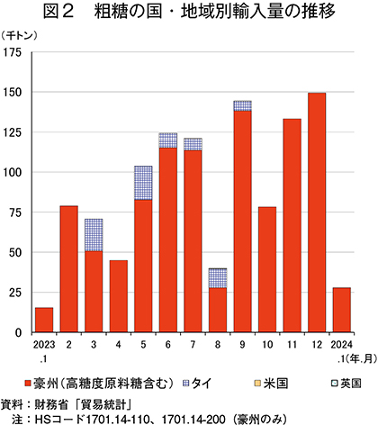 輸入先は甘しゃ糖・分みつ糖については米国、甘しゃ糖・その他については豪州で、国・地域別の輸入量は次の通りであった(図2)。