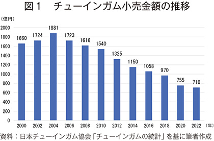 3)、歯の健康に役立つキシリトール入りのガムといった機能性ガムのけん引により、ガム小売金額は2004年にピーク(1881億円)を迎えました。ただ、口臭ケアでの錠菓(タブレット)の台頭や、暇つぶしなどのすき間時間でのスマートフォンへの代替、車の運転や新型コロナ禍での外出機会の減少などさまざまな要因がある中で、翌2005年から2022年まで小売金額は下降の一途をたどり続け、2022年には710億円と2004年比で実に37.7%にまで落ち込んでいました(図1)。