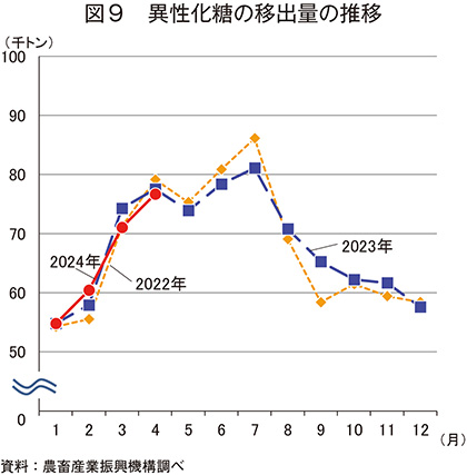 2024年4月の異性化糖の移出量は、7万6691トン(前年同月比1.1%減、前月比7.9%増)であった(図9)。
