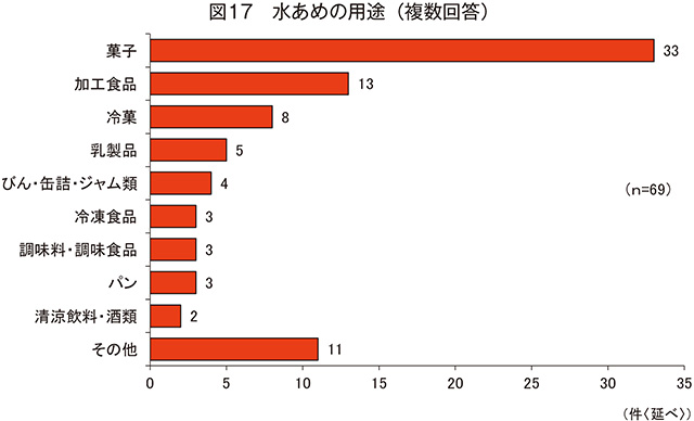 水あめの用途を見ると、「菓子」が33件と最も多く、次いで「加工食品」が13件、「冷菓」が8件、「乳製品」が5件となっている(図17)。その他に分類される用途には、粉末茶、ホイップクリーム、水産練り製品などが挙げられた。