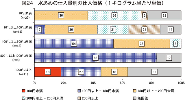 仕入量別に仕入価格を見ると、仕入量が「1トン未満」では「200円以上250円未満」が43%と最も多く、「250円以上」の割合も3割と多かった(図16)。仕入量が「10トン以上100トン未満」では、「150円以上200円未満」が5割を占め、「250円以上」の回答はなかった。仕入量が「100トン以上500トン未満」になると、「100円以上150円未満」が33%、「100円未満」も8%見られ、仕入量の増加に伴って仕入価格が下がる傾向がうかがえる。