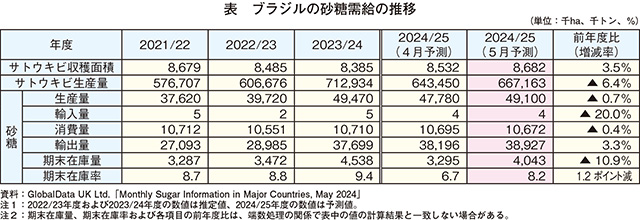 砂糖輸出量は、生産量がわずかに減少する見込みであるものの、インド産やタイ産の輸出が振るわないことから、引き続き国際市場でのブラジル産砂糖の堅調な需要が期待され、3893万トン(同3.3%増)とやや増加が見込まれている。
