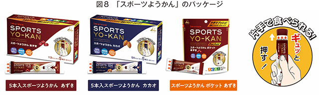 また、「えいようかん」に続き、スポーツシーンにおける最適なパッケージを検討しました(図8)。走りながらでも片手で食べやすい、開封時にゴミが出ない、押すだけで簡単に食べられるパッケージです。ようかんの中央部を押すことで、押し出されたようかんの力でシール部が開封され、そのまま食べることができれば、アスリートはよりレースに集中できると考えました。そこで、フィルムメーカーや機械メーカーと何度もミーティングを重ね、最適な力で押し出せる「スポーツようかん」が完成しました(2014年 特許第6114206号取得)。