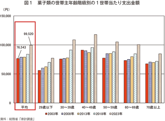しかし、明治、大正、昭和、平成、令和と時代が進むにつれ、和菓子の需要も変化してきました。直近20年間の需要について、総務省の家計調査による1世帯当たりの支出金額を見てみましょう。菓子カテゴリー全体では、2003年の1年当たり7万6543円から2023年には9万9520円へと、支出金額が30%増加しています(図1)。一方で、ようかんカテゴリーでは、平均の支出金額が1年当たり910円から696円と、24%も減少していることがわかります(表)。