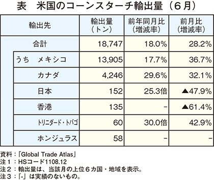 2024年6月の米国のコーンスターチ輸出量は、1万8747トン(前年同月比18.0%増、前月比28.2%増)と前年同月および前月から大幅に増加した(表、図)。