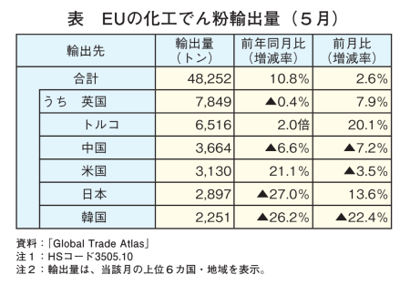 2024年5月の化工でん粉の輸出量は、2万4024トン(前年同月比0.2%減、前月比9.8%減)と前年同月並みであり、前月からかなりの程度減少した(表、図)。