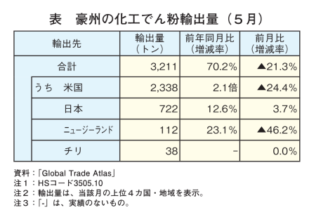 2024年5月の化工でん粉の輸出量は、3211トン(前年同月比70.2%増、前月比21.3%減)と前年同月を大幅に上回り、前月から大幅に減少した(表、図)。