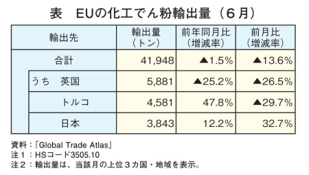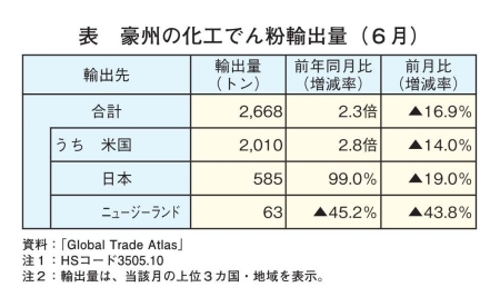 2024年6月の化工でん粉の輸出量は、7万9850トン(前年同月比9.7%減、前月比7.4%減)と前年同月および前月からかなりの程度減少した(表、図)。