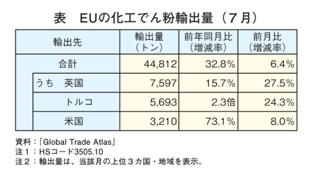 2024年7月の化工でん粉の輸出量(注)は、4万4812トン(前年同月比32.8%増、前月比6.4%増)と前年同月を大幅に上回り、前月からかなりの程度増加した(表、図)。