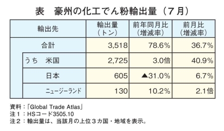 2024年7月の化工でん粉の輸出量は、3518トン(前年同月比78.6%増、前月比36.7%増)と前年同月および前月から大幅に増加した(表、図)。