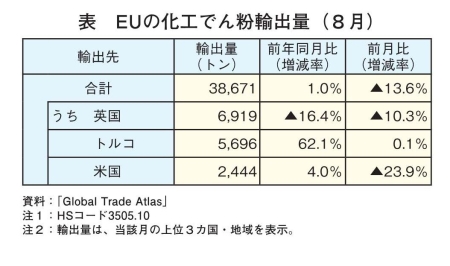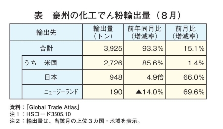 2024年8月の化工でん粉の輸出量は、3925トン(前年同月比93.3%増、前月比15.1%増)と前年同月を大幅に上回り、前月からかなり大きく増加した(表、図)。