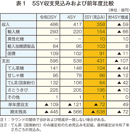 一方、異性化糖については、13年ぶりに令和6年1月から機構売買が発生したことや同年4月から運用見直しが行われたことなどから10億円、輸入加糖調製品については、前SYより8億円増の103億円の収入となったものの、輸入糖収入の低下が響き、国費も含む収入全体では前SYより59億円減の358億円となった。