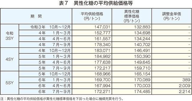 5SYの異性化糖等の売買は、令和5年10−12月期までは、異性化糖の平均供給価格(機構の買入価格)が異性化糖標準価格(機構の実質的な売戻価格)を上回ったことから、売買は行われなかったが、令和6年1−3月期以降は平均供給価格が標準価格を下回り13年ぶりに売買が発生した。また、同年4月以降異性化糖売買の運用見直しが行われ、引き続き売買が発生した。これらの結果、異性化糖等の売買数量は60万1000トン、調整金収入は10億1000万円となった(表8)。