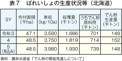 5SYについて、需給見通しによると、単収増により収穫量は増加したものの、酷暑によりでん粉含有率の低下が生じたため、ばれいしょでん粉の生産量は、前年度比2.6%減の14万8000トンとなる見込みである(表7)。