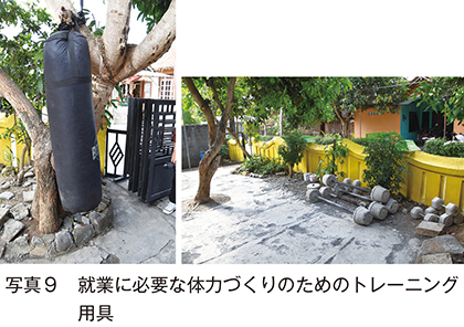 この過程では在籍者は、たとえ近傍に居住する者であれ、LPKが用意する寮(写真8)に、1室複数人で住むよう定められている。日本で就業すれば彼らは共同部屋で暮らすことが予想され、その際に必要となる生活上のスキルや周囲の人間との付き合い方を、この寮生活から学ぶためである。その他にも日本での就業を念頭に、朝礼(日本式の行進やラジオ体操を行う)や頻繁な掃除が、日々のスケジュールに組み込まれている。「運動」が、腕立て伏せや「手押し車」など筋力トレーニングに重点を置く内容となっているのは、日本で就業した際に必要な体力づくりを意図している(写真9)。近年インドネシアでは、短い距離であれバイクで移動することが増えている。対して、日本での工場・敷地内の移動は徒歩か自転車であることも、LPKが体力づくりを重要視する理由の一つである。