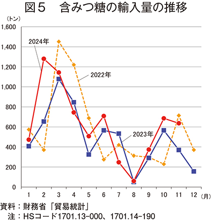 財務省「貿易統計」によると、2024年11月の含みつ糖(HSコード 1701.13-000、1701.14-190)の輸入量は、637トン(前年同月比72.2%増、前月比7.1%減)であった(図5)。