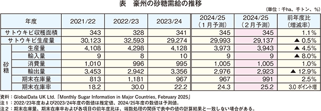 2024/25年度(4月〜翌3月)のサトウキビ収穫面積は、35万ヘクタール(前年度比1.1%増)とわずかな増加が見込まれている(表)。サトウキビ生産量は、頻発した豪雨と豪州最大の精糖企業で発生したストライキなどで収穫が遅れ、2914万トン(同0.5%減)とわずかな減少が見込まれている。現地報道によれば、一部の製糖工場を除いて24/25年度の製糖を終えたとされている。