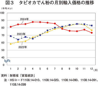 財務省「貿易統計」によると、2024年12月のばれいしょでん粉の輸入量は457トン(前年同月比9.0%減、前月比44.0%減)と、前年同月からかなりの程度減少した(図7)。
