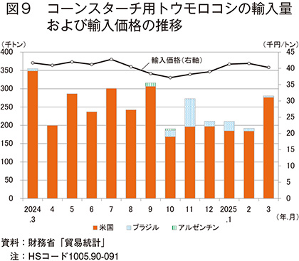 財務省「貿易統計」によると、2025年3月のコーンスターチ用トウモロコシの輸入量は、28万473トン(前年同月比21.0%減、前月比46.1%増)となり、前年同月から大幅に減少した(図9)。