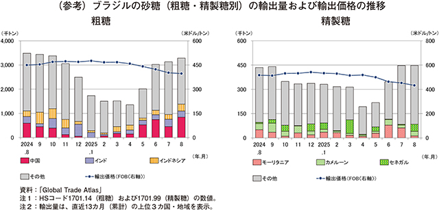 砂糖生産量は、サトウキビの減産およびサトウキビの歩留まり指標となるATR(注)の減少が見込まれる中、引き続き製糖企業によるサトウキビの砂糖仕向けの割合は高い状態にあるものの、4628万トン(同1.9%減)とわずかな減少が見込まれている。世界の砂糖相場が下落傾向にある中、同国では8月1日よりガソリンのエタノール30%混合(E30)が義務付けられており、今後のエタノール生産の動向が注目される。砂糖輸出量は、3548万トン(同2.1%減)とわずかな減少が見込まれているが、引き続き国際市場でのブラジル産砂糖に対する堅調な需要が見込まれている。