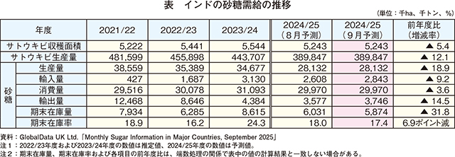 2024/25年度(10月〜翌9月)のサトウキビ収穫面積は、主産地での競合作物への転作などから524万ヘクタール(前年度比5.4%減)とやや減少が見込まれている(表)。サトウキビ生産量は、干ばつと一部地域で発生した赤腐病(red rot)(注)の影響により、3億8985万トン(同12.1%減)とかなり大きく減少が見込まれている。