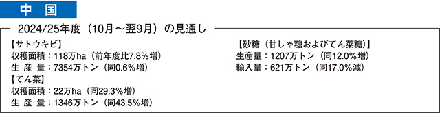 2024/25年度(10月〜翌9月)のサトウキビの収穫面積は、118万ヘクタール(前年度比7.8%増)とかなりの程度増加が見込まれている(表)。サトウキビ生産量は、主産地である広西チワン族自治区の高温干ばつ傾向により、7354万トン(同0.6%増)とわずかな増加が見込まれている。